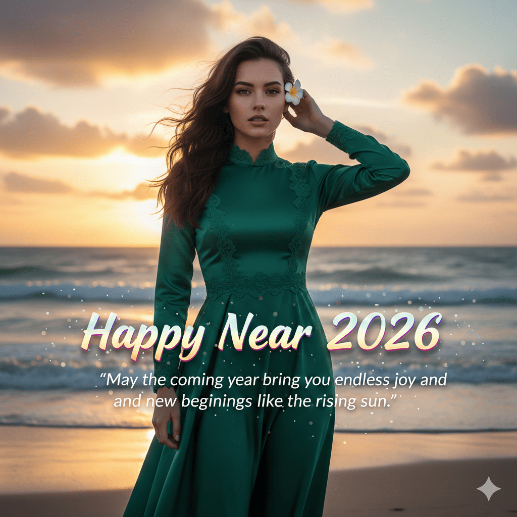 Create a modern, high-definition image—vibrant and crisp—based on the uploaded picture. The girl should be wearing a modest, elegant floor-length emerald green silk gown with a high neckline, long sleeves, and delicate lace detailing along the bodice and hem, high-fashion lifestyle editorial portrait style. The vibe must capture the essence of a '90s movie 'baddie,' with dark brown, silky hair and a small flower tucked visibly into her hair, enhanced by a windy, romantic atmosphere. She is standing on a serene beach with a stunning sunset over the ocean, where gentle waves lap at the shore and golden hues paint the sky, creating a peaceful and hopeful cinematic effect. Her pose should suggest that she is adjusting her hair. The girl's face must remain exactly the same as in the provided reference photo, with no alterations. Overlay the positive New Year quote in a sleek, modern sans-serif font with vibrant gradients, playful animations like subtle sparkles, and an energetic glow to evoke joy and excitement: "May the coming year bring you endless joy and new beginnings like the rising sun." Also overlay the highlighted text "Happy New Year 2026" prominently in a bold, contemporary script with iridescent colors, dynamic shadows, and festive confetti effects to stand out as the main greeting, perfect for social media shares.