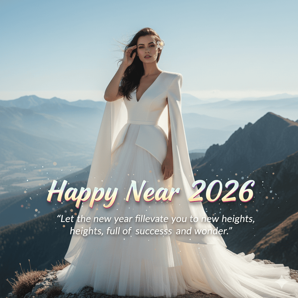 Create a modern, high-definition image—vibrant and crisp—based on the uploaded picture. The girl should be wearing an avant-garde Dior couture ivory cape gown with structured shoulders and layered tulle trains, high-fashion lifestyle editorial portrait style. The vibe must capture the essence of a '90s movie 'baddie,' with dark brown, silky hair and a small flower tucked visibly into her hair, enhanced by a windy, romantic atmosphere. She is standing atop a majestic mountain peak with rolling hills and misty valleys below, where crisp air and distant peaks evoke strength and serenity, creating an inspiring and adventurous cinematic effect. Her pose should suggest that she is adjusting her hair. The girl's face must remain exactly the same as in the provided reference photo, with no alterations. Overlay the positive New Year quote in a sleek, modern sans-serif font with vibrant gradients, playful animations like subtle sparkles, and an energetic glow to evoke joy and excitement: "Let the new year elevate you to new heights, full of success and wonder." Also overlay the highlighted text "Happy New Year 2026" prominently in a bold, contemporary script with iridescent colors, dynamic shadows, and festive confetti effects to stand out as the main greeting, perfect for social media shares.