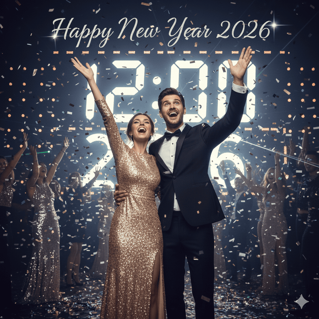 मेरी फोटो को न्यू ईयर 2026 के काउंटडाउन मोमेंट में बदलें, जहां नाइट पार्टी का शानदार माहौल है। बैकग्राउंड में चमकती लाइट्स के बीच एक बड़ी डिजिटल घड़ी ठीक 12:00 दिखा रही है, जो नए साल के आगमन को दर्शाती है।लड़की एक्साइटेड एक्सप्रेशन में हो, उसने स्टाइलिश और फैंसी ड्रेस पहनी हुई है, जो पूरे सीन को ग्लैमरस बनाती है। चारों ओर सेलिब्रेशन वाइब्स हैं और ऊपर खूबसूरत फॉन्ट में “Happy New Year 2026” लिखा हुआ है, जो इस यादगार पल को और खास बना देता है।