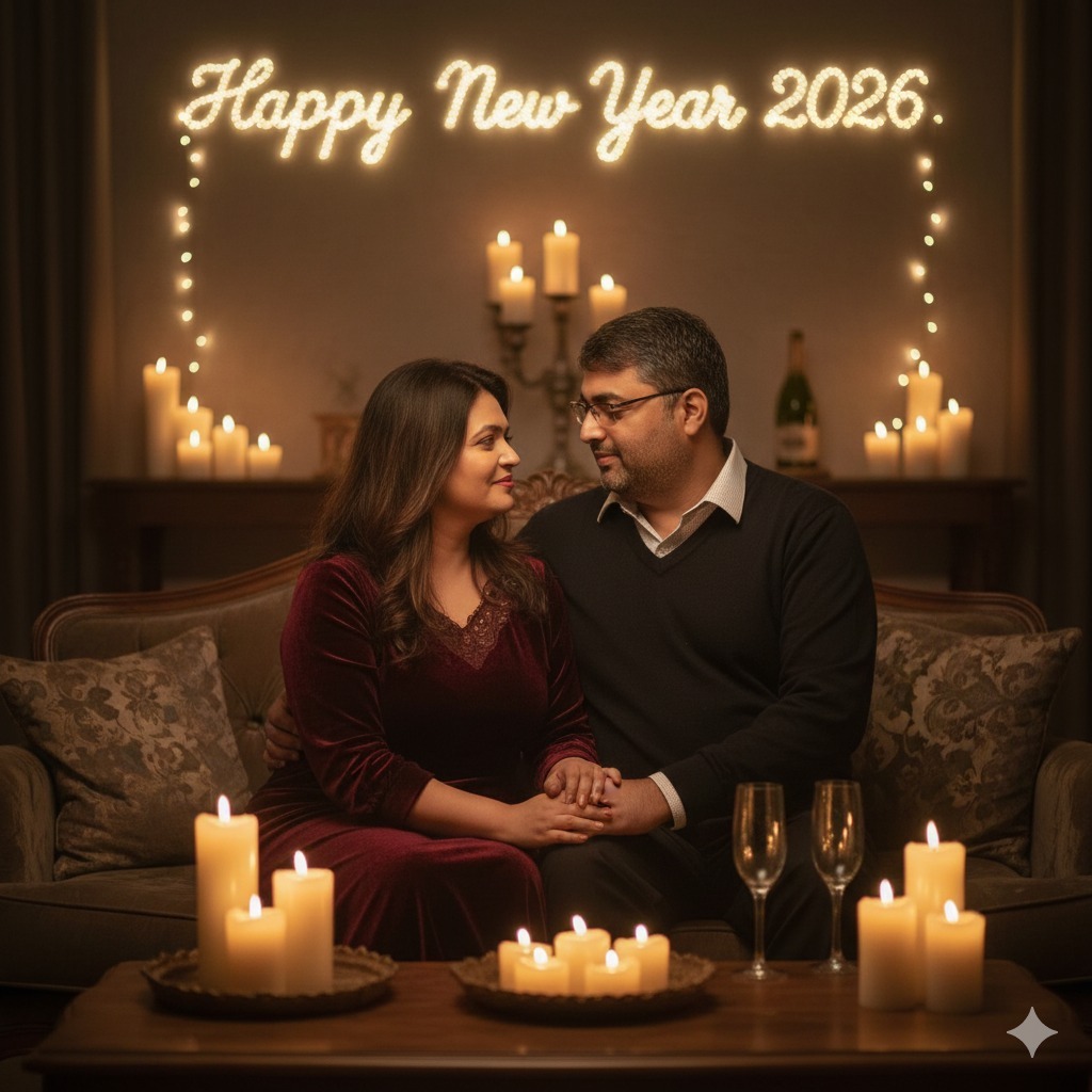 मेरी कपल फोटो को इंटिमेट न्यू ईयर 2026 सेलिब्रेशन में बदलें। हल्की रोशनी, मोमबत्तियां, आरामदायक लेकिन क्लासी कपड़े में हम बैठे हो। बैकग्राउंड में सॉफ्ट स्टाइल में ‘Happy New Year 2026’ लिखा हो। फोटो में शांत, रोमांटिक माहौल और चेहरे बिल्कुल वही रखें।