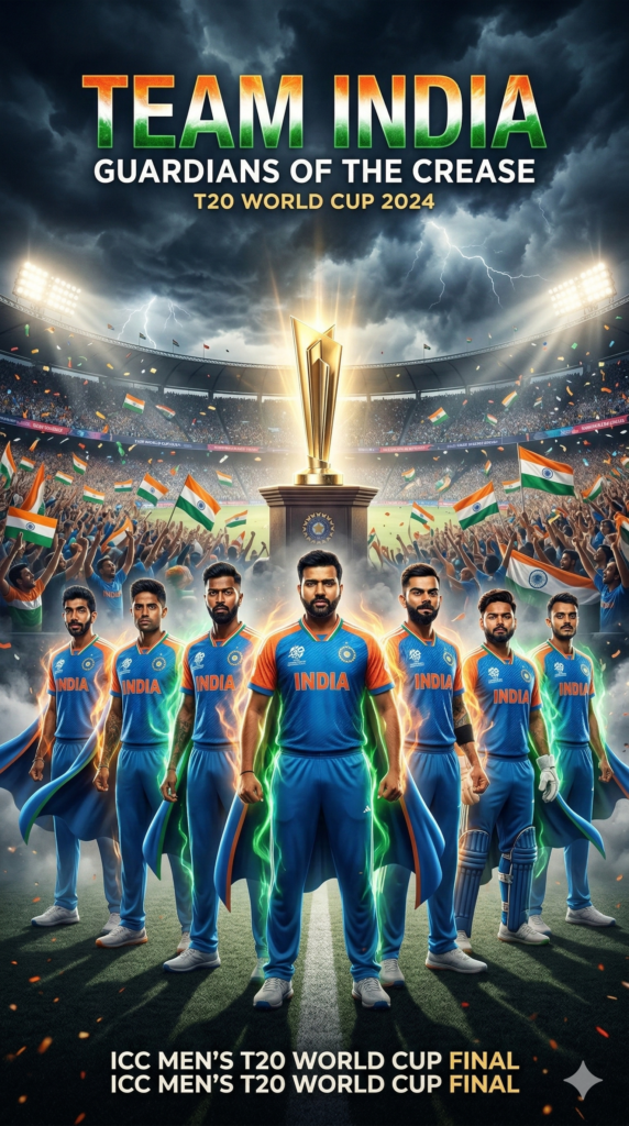 Prompt 4: “Epic cinematic poster of the Indian cricket team as powerful superheroes, wearing blue Team India jerseys with glowing saffron-white-green tricolor energy aura, standing heroically in a massive cricket stadium before the T20 World Cup final, dramatic storm clouds and stadium floodlights behind them, capes flowing in the wind, determined expressions on their faces, thousands of fans waving Indian flags in the stands, the T20 World Cup trophy glowing in the background, ultra-detailed, hyper-realistic, epic lighting, cinematic superhero style, 8K, patriotic atmosphere”