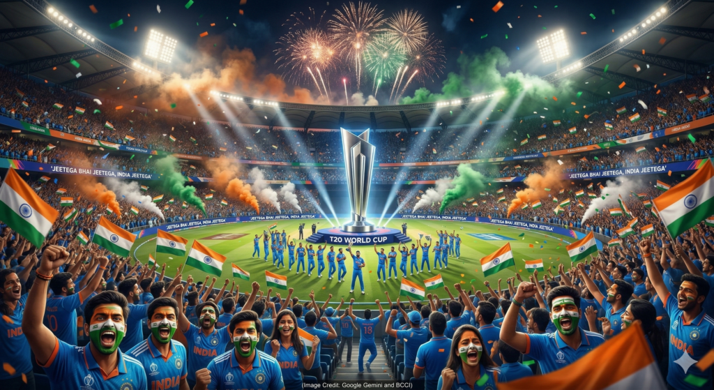 Prompt 8: “Massive crowd of passionate Indian cricket fans wearing blue jerseys and waving Indian tricolor flags in a packed stadium, faces painted with the Indian flag, chanting ‘Jeetega Bhai Jeetega India Jeetega’, dramatic stadium lights, saffron-white-green smoke filling the air, giant glowing T20 World Cup trophy in the center, fireworks exploding above, emotional celebration, ultra-realistic cinematic sports poster, 8K, highly detailed, epic patriotic atmosphere” (Image Credit: Google Gemini and BCCI)