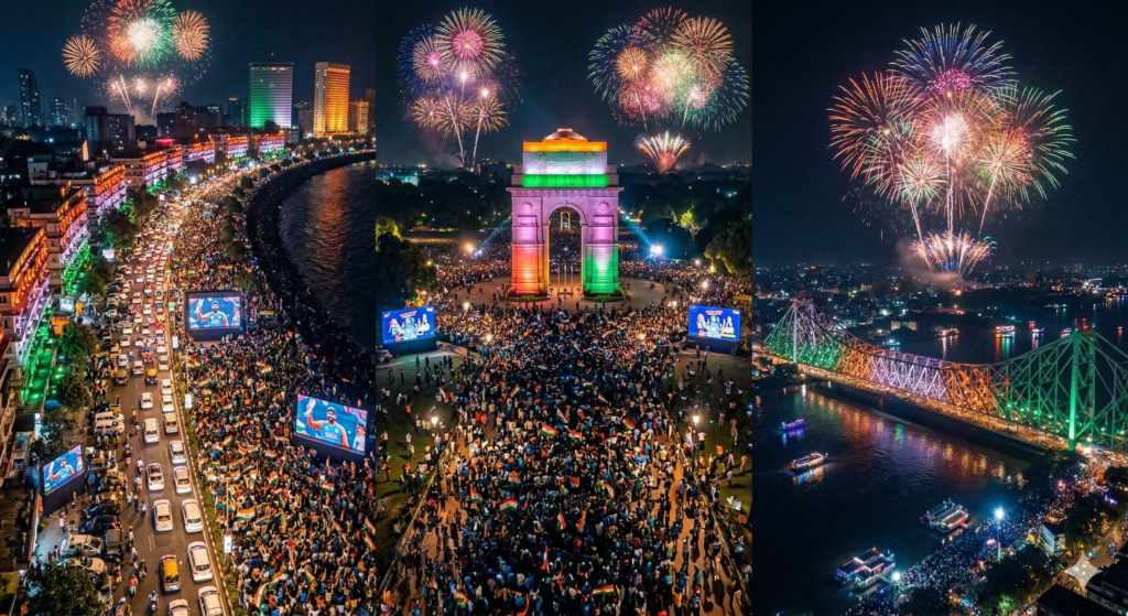 Prompt 6: “Massive celebration across India after Team India wins the T20 World Cup, aerial drone view of cities like Mumbai’s Marine Drive, India Gate in Delhi, and Howrah Bridge in Kolkata lit with tricolor lights, thousands of passionate Indian fans dancing on the streets waving Indian flags, fireworks lighting the night sky, giant public screens showing the World Cup trophy and Team India celebrating, patriotic atmosphere, cinematic drone photography, ultra-realistic, 8K, vibrant colors, emotional nationwide celebration”