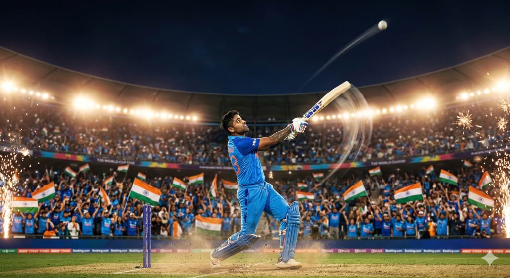 Prompt 3: “Epic cricket moment — Indian captain Suryakumar Yadav smashing a massive six in the T20 World Cup final, bat follow-through frozen in dramatic slow motion, the cricket ball soaring high into the night sky, stadium floodlights glowing intensely, thousands of Indian fans erupting in celebration waving tricolor flags, blue jerseys filling the stands, sparks and fireworks lighting the atmosphere, dust and motion blur around the pitch, cinematic sports photography style, ultra-realistic, hyper detailed, 8K resolution, powerful patriotic energy”