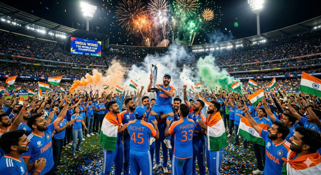 Prompt 2: “Massive celebration after India wins the T20 World Cup, Indian cricket players in blue jerseys lifting the glowing World Cup trophy in the center of a packed stadium, thousands of passionate Indian fans cheering and waving tricolor flags, fireworks exploding across the night sky, saffron-white-green smoke filling the stadium, dramatic stadium floodlights illuminating the scene, confetti raining down, emotional victory moment, ultra-realistic cinematic photography, vibrant colors, epic patriotic atmosphere, 4K, hyper-detailed”