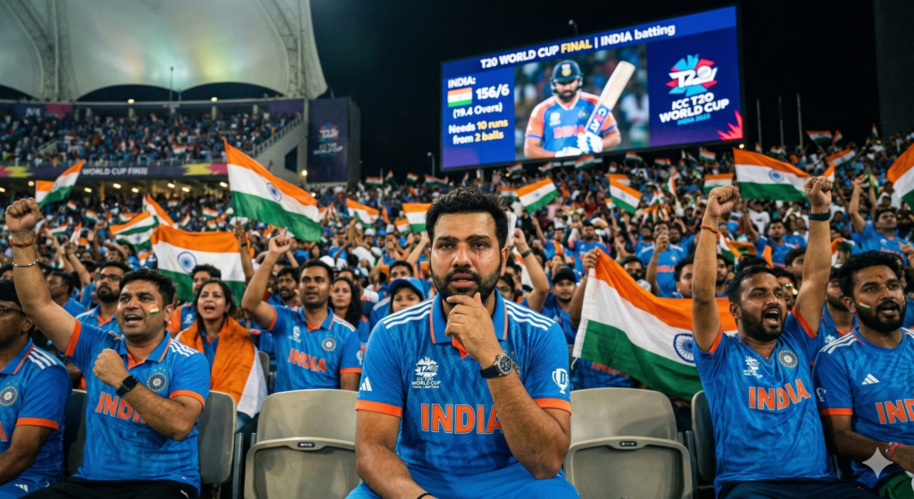 Prompt 7: “Former Indian T20 World Cup–winning captain Rohit Sharma sitting in the stadium stands watching the T20 World Cup final, wearing an India jersey, intense emotional expression, stadium lights glowing in the night, Indian fans waving tricolor flags around him, giant screen showing Team India playing the final, dramatic cinematic sports photography, shallow depth of field, ultra-realistic, 8K, patriotic atmosphere, goosebumps moment”