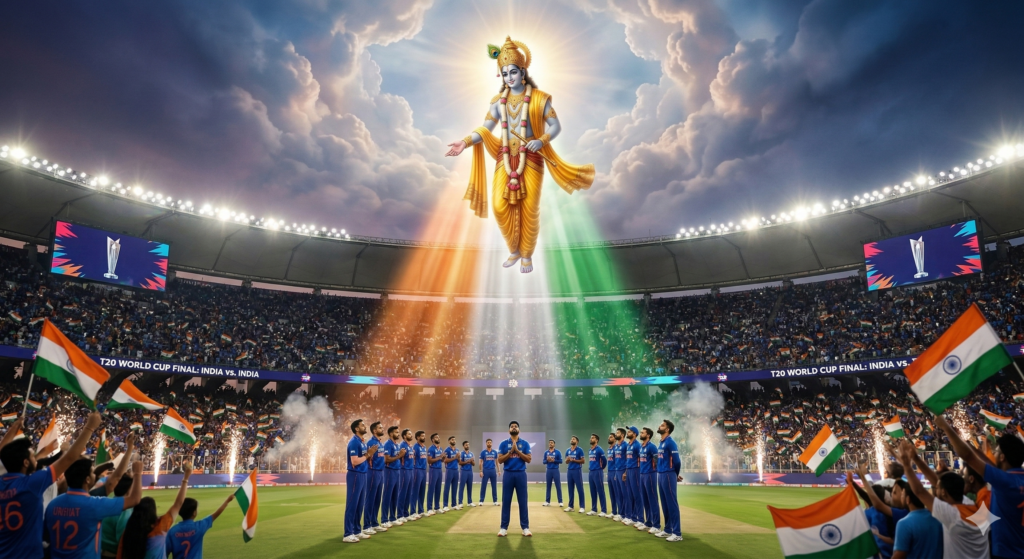 Prompt 5: “Epic divine cricket scene, Lord Krishna floating above a massive glowing cricket stadium, gently blessing the Indian cricket team in blue jerseys before the T20 World Cup final, Krishna holding a flute with a radiant golden aura, celestial clouds opening in the sky, powerful saffron-white-green tricolor light rays illuminating the stadium, Indian players standing determined on the field looking toward the sky, thousands of passionate fans waving Indian flags in the stands, fireworks and spiritual glow surrounding the arena, dramatic cinematic lighting, ultra-realistic, epic mythological sports poster, 8K, hyper-detailed, goosebumps patriotic atmosphere”