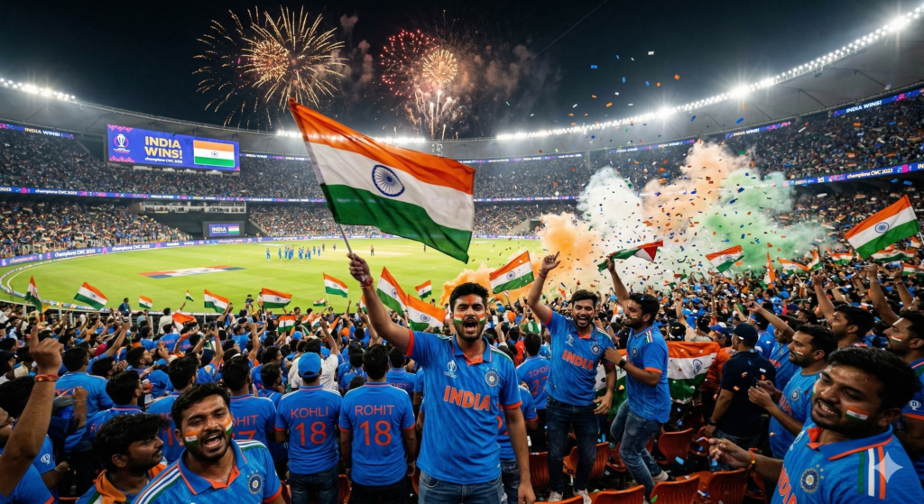 Prompt 1: “Thousands of passionate Indian cricket fans celebrating Team India’s victory in a packed stadium, people wearing blue jerseys and waving Indian tricolor flags, faces painted with the Indian flag, fireworks lighting up the night sky, fans dancing and cheering loudly, saffron-white-green smoke in the air, dramatic stadium floodlights, confetti falling everywhere, ultra-realistic cinematic photography, vibrant colors, emotional patriotic atmosphere, 8K, highly detailed”