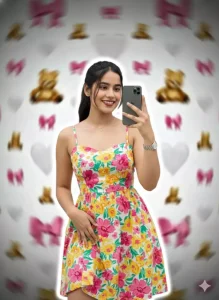 A young girl with a realistic face taking a mirror selfie, wearing a vibrant floral summer dress. She is holding the phone casually with one hand, minimal jewelry, with the same hair and realistic lighting. There's a soft white outline glow around her. The background is a pattern of blurred pink bows, teddy bears, and white hearts. The overall style is an artistic, trendy Instagram-style edit with balanced composition and HD quality, maintaining the same proportions and face."