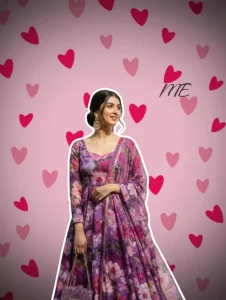 A beautiful young Indian woman (half body)with her hair styled in a bun, wearing elegant golden earrings, and a flowing purple floral print Anarkali suit with a dupatta. She is smiling and looking to the side. Style: The woman has a prominent white outline border around her body, giving her a sticker-like or cutout appearance. The background is a solid light pink color, filled with numerous red and darker pink heart shapes of varying sizes, scattered randomly. There's also some subtle white text "ME" in a handwritten style on the top right. High-quality, aesthetic fashion photography."