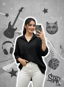 A young girl realistic face taking a mirror selfie, wearing a black loose shirt and white pants, holding theshirt casually with one hand, minimal jewelry, same hair, realisticlighting, and soft white outline glowaround him.The background is amodern grayscale aesthetic collagewith elements like electric guitar, headphones, dice, cat face decor, 3Dstars, and "STAR"graffiti text.Artistictrende Instagram-style edit with balanced composition and HD quality, same proportions.100%same face."