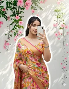 A young girl with a realistic face taking a mirror selfie, wearing a vibrant floral saree and blouse, holding the phone casually with one hand, minimal jewelry, with the same hair and realistic lighting. There's a soft white outline glow around her. The background features pink cascading flowers and green leaves against a white wall with dappled sunlight. The overall style is an artistic, trendy Instagram-style edit with balanced composition and HD quality, maintaining the same proportions and face."