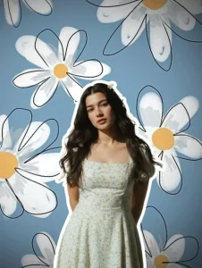 ​"A beautiful young woman with long, dark, wavy hair, looking directly at the viewer with a neutral expression. She is wearing a light-colored summer dress with a delicate floral pattern, a square neckline, and short sleeves. There's a small white flower tucked into her hair. The background is a solid light blue color, featuring large, stylized hand-drawn white daisy flowers with yellow centers, scattered irregularly across the frame. The woman has a prominent white border outlining her figure, separating her from the background. Bright, natural lighting."