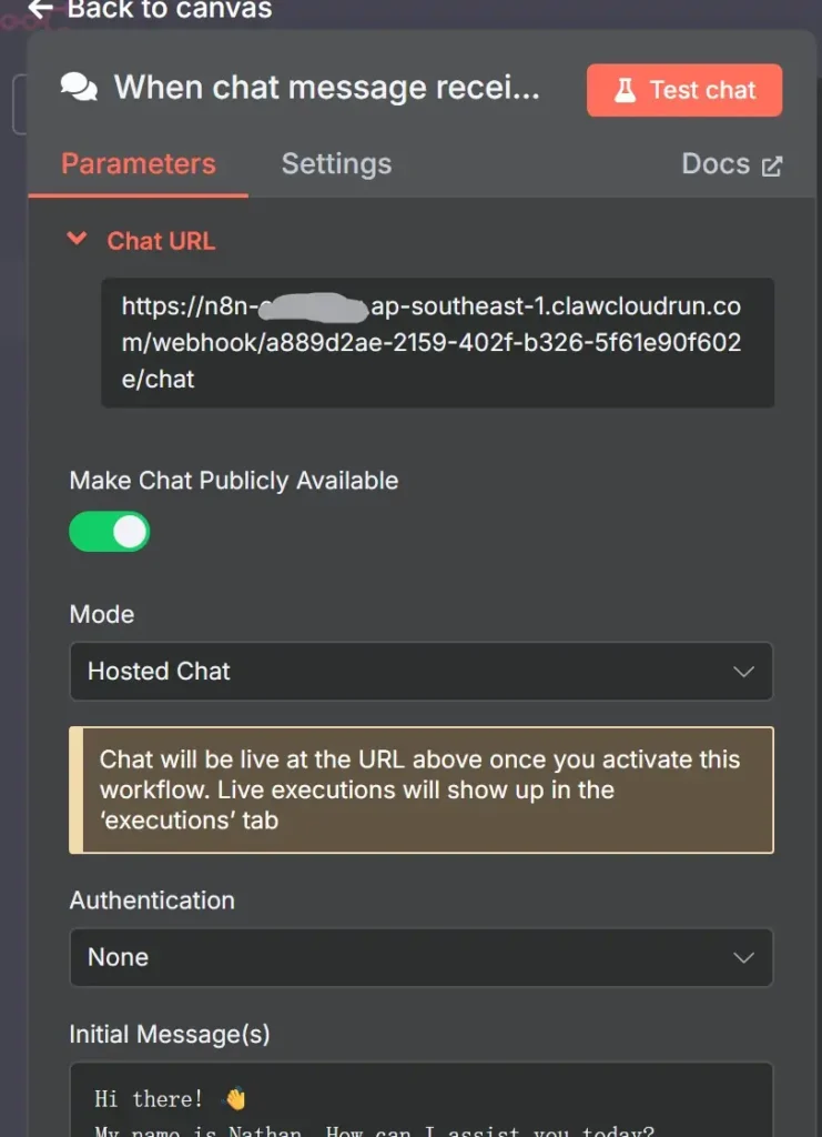 चैट ट्रिगर खासतौर पर AI-संचालित चैटबॉट और संवादात्मक एजेंट बनाने के लिए डिज़ाइन किया गया है। यह ट्रिगर एक एंडपॉइंट तैयार करता है, जिसे आप अपने एआई वर्कफ़्लो के साथ इंटरैक्ट करने के लिए इस्तेमाल कर सकते हैं।