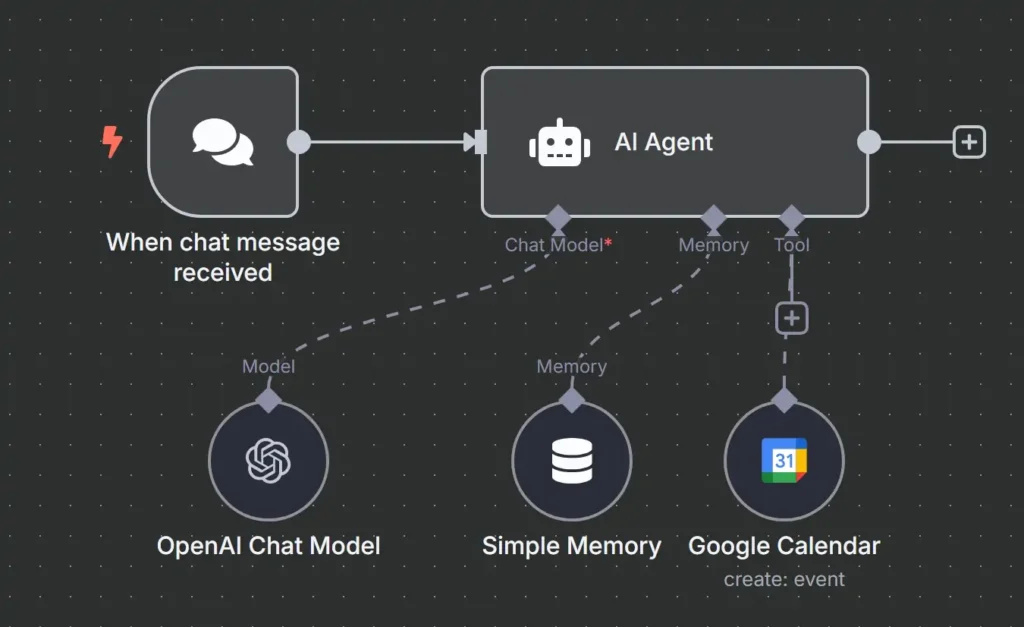 चैट ट्रिगर को काम करने के लिए LangChain एजेंट या Chain नोड के साथ कनेक्ट होना चाहिए। यह ट्रिगर उपयोगकर्ता के साथ होने वाली बातचीत को संभालता है, जबकि एजेंट नोड AI लॉजिक, मेमोरी मैनेजमेंट और भाषा मॉडल से कनेक्शन को नियंत्रित करता है।