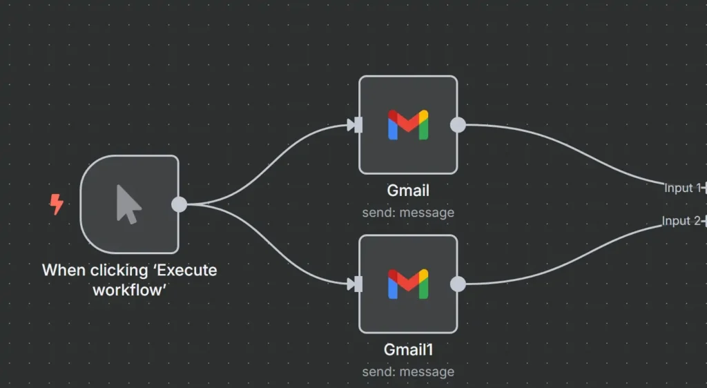 मैनुअल ट्रिगर, जो “वर्कफ़्लो निष्पादित करें” बटन पर क्लिक करने से सक्रिय होता है, एक ऐसे वर्कफ़्लो को शुरू करता है जिसमें Gmail नोड्स का उपयोग करके दो अलग-अलग ईमेल भेजे जाते हैं।