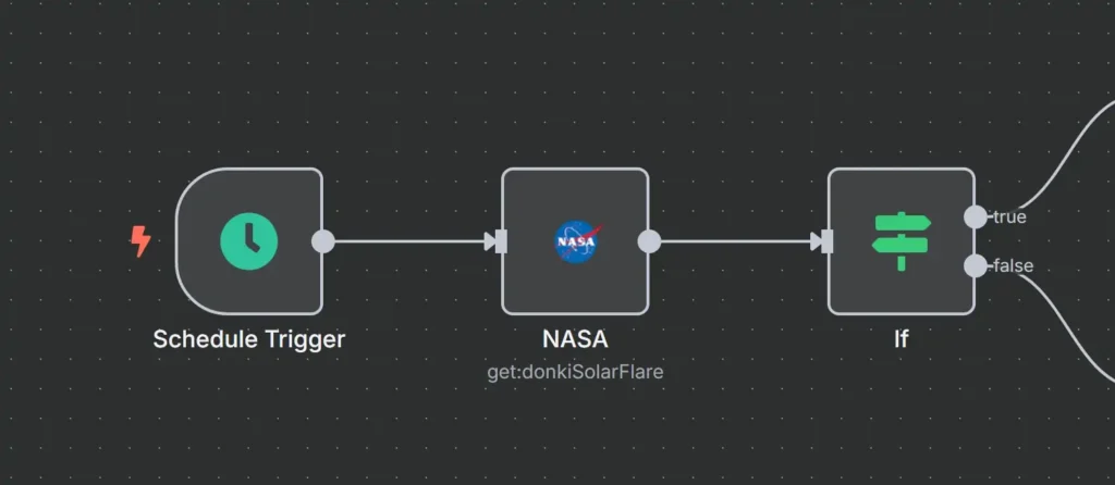 यह एक उदाहरण वर्कफ़्लो है जो शेड्यूल ट्रिगर से शुरू होता है, इसके बाद NASA से डेटा प्राप्त करता है, और फिर प्राप्त जानकारी के आधार पर अगला कदम तय करने के लिए If नोड का उपयोग करता है।