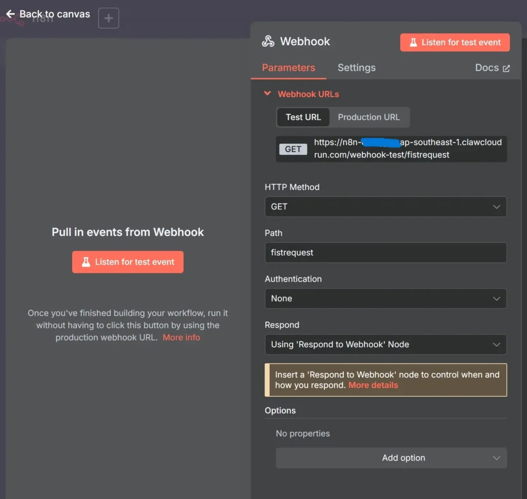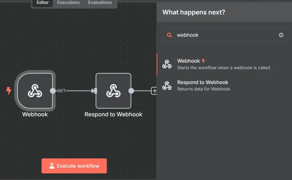 कैनवास पर रखा गया वेबहुक नोड, “वेबहुक का जवाब दें” नोड से जुड़ा होता है। यह सेटअप वेबहुक के माध्यम से आने वाली रिक्वेस्ट्स को सही और व्यवस्थित तरीके से संभालने का सबसे प्रभावी तरीका माना जाता है।