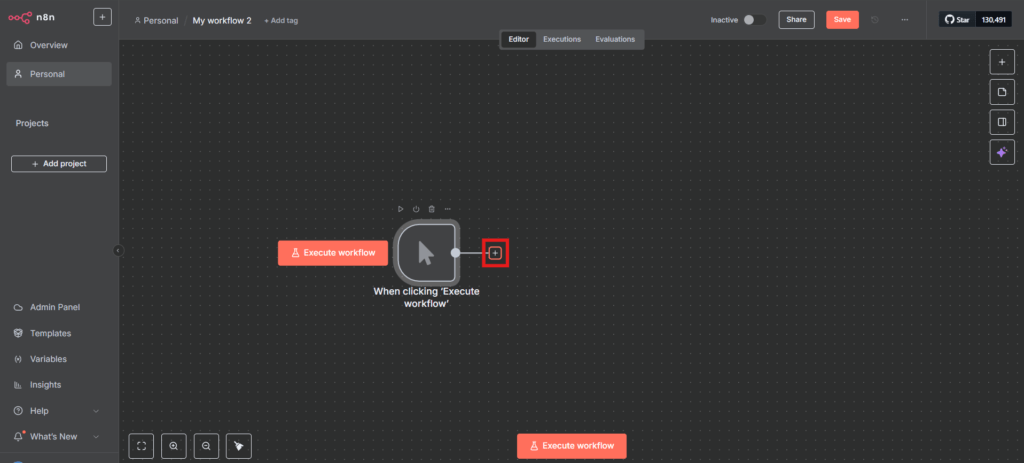 सबसे पहले हमें n8n में एक वर्कफ़्लो तैयार करना होगा, जिसे बाद में Google Sheets के साथ जोड़ा जाएगा। नया वर्कफ़्लो बनाने के लिए नीचे दिए गए आसान चरणों का पालन करें: