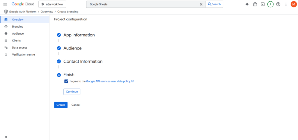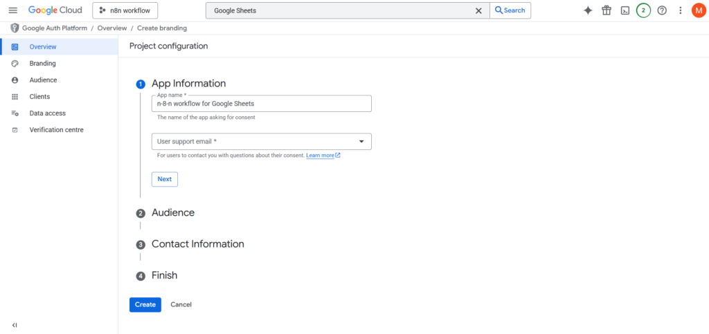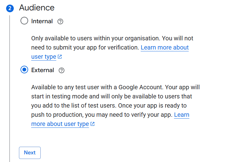 - बाहरी विकल्प यह सुनिश्चित करता है कि आपका ऐप केवल आपके संगठन तक सीमित न रहे, बल्कि किसी भी Google अकाउंट उपयोगकर्ता द्वारा एक्सेस किया जा सके। यह आवश्यक है क्योंकि n8n आपके Google Workspace डोमेन से डायरेक्टली जुड़ा नहीं है।