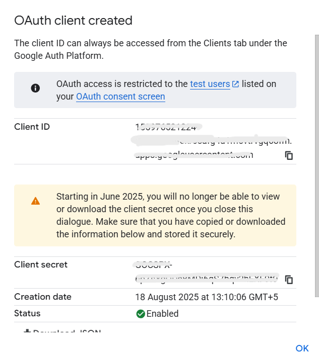 4.एक बार सभी विवरण भर दिए जाने के बाद, “Create” या “बनाएँ” बटन पर क्लिक करें। इसके बाद एक डायलॉग बॉक्स खुलेगा जिसमें आपकी Client ID और Client Secret हाइलाइट की हुई दिखाई देंगी।