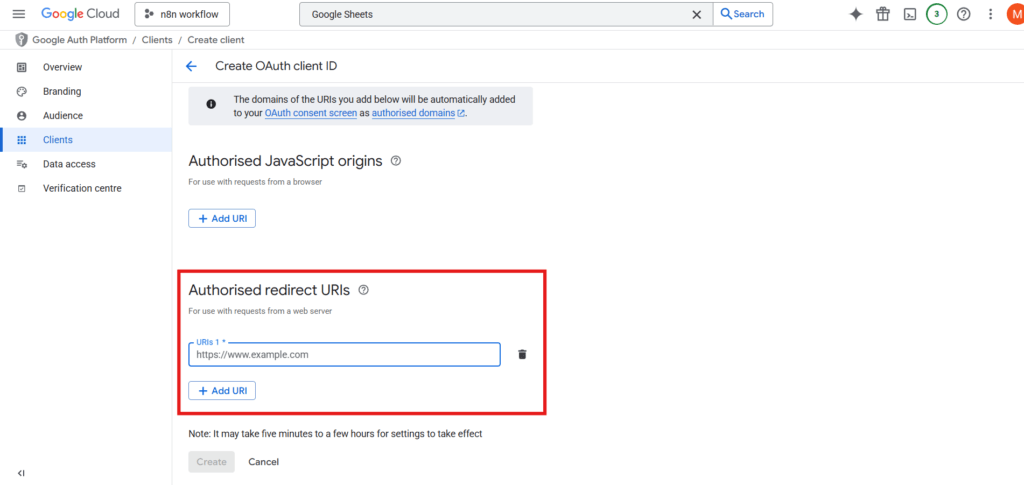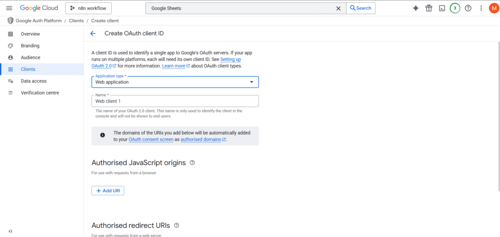 3.यदि आप n8n वर्कफ़्लो के पेड यूज़र हैं, तो Google Sheets नोड के कनेक्ट होते ही आपको एक Client ID मिल जानी चाहिए। इस Client ID को Authorized JavaScript origins सेक्शन में पेस्ट करें, ताकि Google यह पहचान सके कि अनुरोध आपके ऐप से ही आ रहा है।