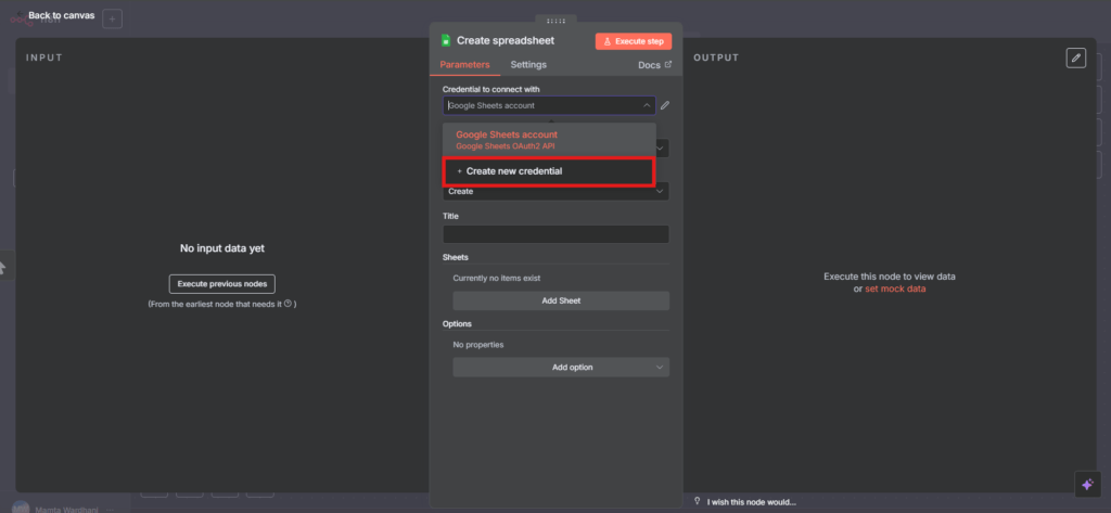 7.इस विंडो में “Connect to” या “कनेक्ट करने के लिए क्रेडेंशियल” सेक्शन पर जाएँ और वहाँ से “Create New Credential” या “नया क्रेडेंशियल बनाएं” विकल्प का चयन करें, ताकि आप Google Sheets के लिए नई ऑथेंटिकेशन सेटिंग जोड़ सकें।