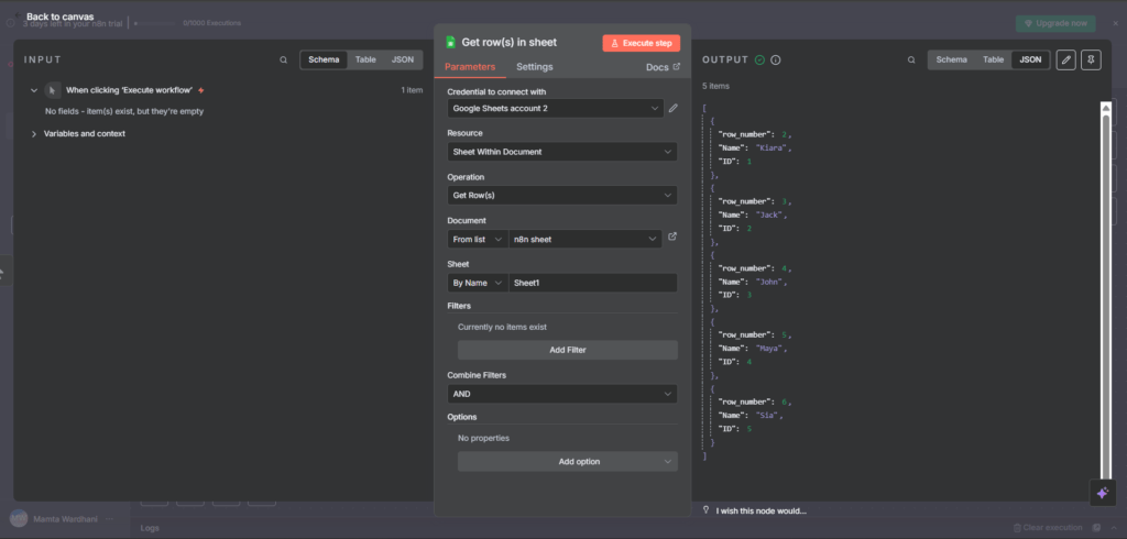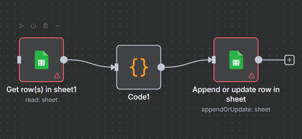 - Google Sheets नोड (Write): साफ़ किए गए डेटा को नई शीट में आउटपुट करता है।