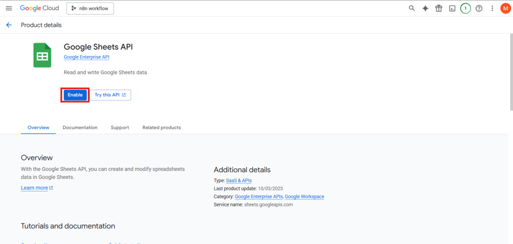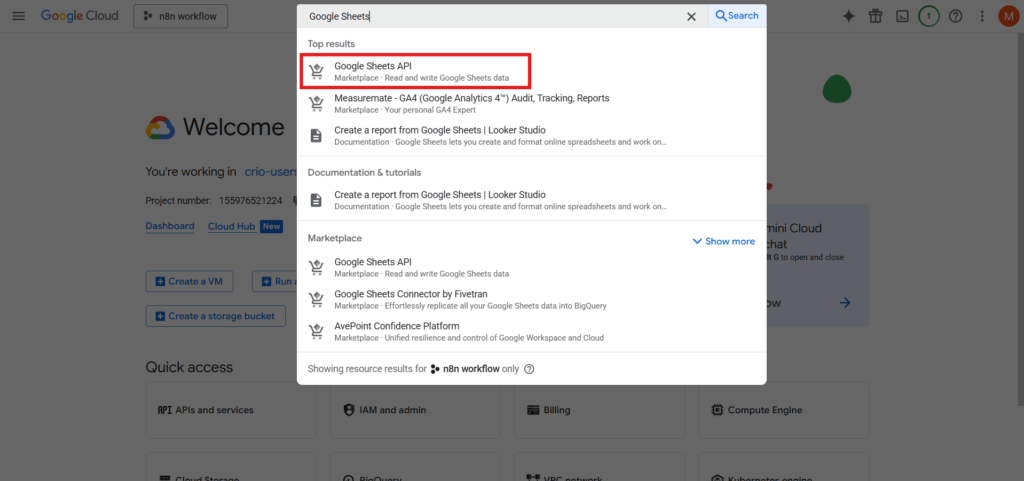 एक बार Google Sheets API सक्षम हो जाने के बाद, आपका प्रोजेक्ट अब n8n के माध्यम से Google Sheets से जुड़ने के लिए तैयार है।