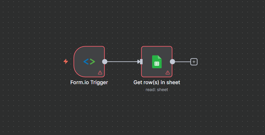 4.अब इस ट्रिगर नोड को Google Sheets नोड से जोड़ना है। इसके लिए ट्रिगर नोड पर दिखाई देने वाले “+” (Add Node) विकल्प पर क्लिक करें। इससे आप अगले स्टेप के लिए Google Sheets नोड जोड़ सकेंगे।