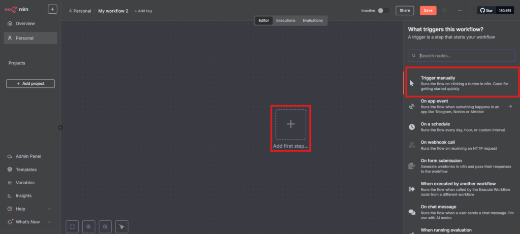 3.अब “पहला चरण जोड़ें” बटन पर क्लिक करें। इसके बाद दाईं ओर दिखाई देने वाले मेनू में से “Manual Trigger” या “मैन्युअल रूप से ट्रिगर करें” नोड चुनें। यह नोड आपके वर्कफ़्लो को टेस्ट करने के लिए शुरुआती ट्रिगर का काम करेगा।