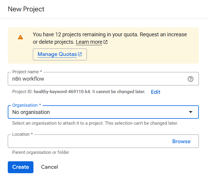 अब हम आपके Google Sheets क्रेडेंशियल्स को सुरक्षित और व्यवस्थित रखने के लिए एक अलग Google Cloud प्रोजेक्ट बनाएंगे। एक समर्पित प्रोजेक्ट होने से API सक्रिय करना और n8n के लिए OAuth कुंजियाँ तैयार करना आसान हो जाता है तथा सभी सेटिंग्स एक ही जगह साफ़-सुथरी रहती हैं।