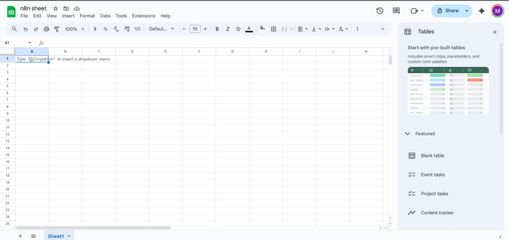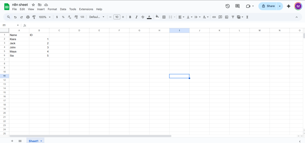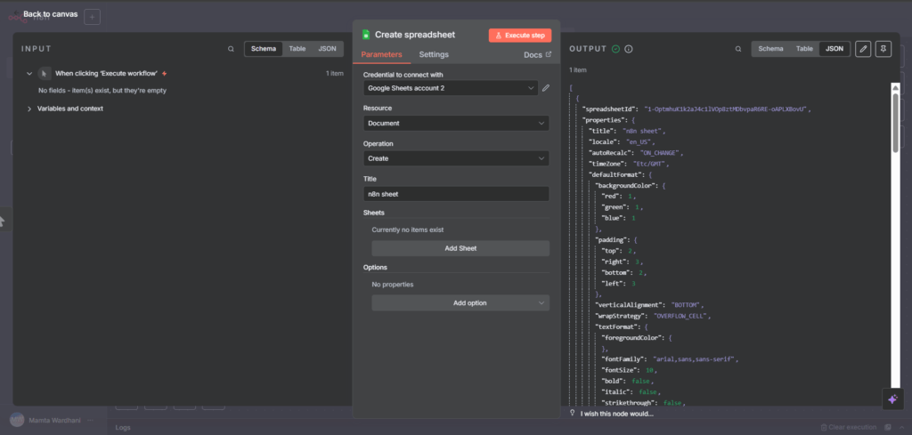 और इस तरह, हमने अपने n8n वर्कफ़्लो का उपयोग करके एक खाली Google शीट सफलतापूर्वक बना ली है!