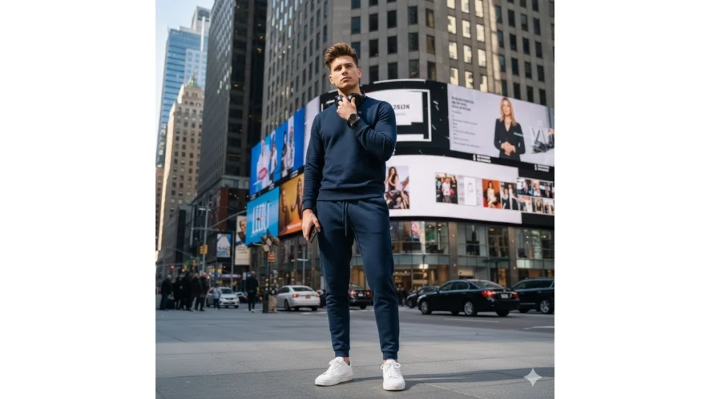 "Ultra-realistic urban portrait of the same young man with the same face and perfectly styled hairstyle as the uploaded image. Standing in bright daylight near a luxury American skyscraper with giant LED advertising screens. Relaxed pose with left hand lightly touching the chin and right hand holding a smartphone, head slightly tilted. Wearing a navy blue sweatshirt and matching sweatpants, white low-top sneakers, a dark minimalist watch, and black headphones around the neck. Sharp daylight, crisp textures, premium high-fashion street-style aesthetic."
