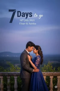 EDITABLE SECTION Countdown Number: 7 DAYS TO GO Wedding Date: 18th July 2021 Couple's Names: Utsav & Anisha DESIGN INSTRUCTIONS (DO NOT CHANGE) Core Directive for Face Preservation: Use the uploaded image only to preserve the couple’s faces and real likeness. Replace the pose, clothes, and background according to the description below — but ensure both faces match the uploaded couple’s appearance, tone, and expressions naturally. Overall Aesthetic: Romantic, elegant, and atmospheric, capturing