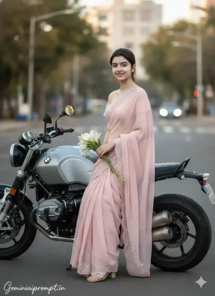 IMPORTANT – FACE LOCK Use the uploaded reference image only. Face must remain 100% identical and instantly recognizable. No smoothing, no reshaping, no AI face alteration. Maintain real pores, natural highlights, and authentic human skin texture. Face must look like real photography, not digital art. SCENE TYPE High-end cinematic luxury lifestyle portrait on city road. SUBJECT & POSE DETAILS Indian girl sitting sideways on a BMW R nineT luxury motorcycle, one foot resting on the road. Upper body upright, shoulders relaxed. One hand resting on the bike seat. Other hand holding white lily flowers close to her lap. Graceful seated pose with relaxed confidence. EXPRESSION & MOOD • Gentle closed-lip smile • Calm, elegant expression • Eyes softly looking toward camera • Modern royal vibe OUTFIT DETAILS • Soft blush-pink saree with silver thread embroidery • Flowing chiffon fabric • Matching pastel blouse • Saree drape naturally cascading over the bike BIKE DETAILS • BMW R nineT • Premium metallic grey finish • Classic luxury design • Clean reflections and realistic texture BACKGROUND & ATMOSPHERE • City road with greenery • Streetlights and buildings behind • Mild background softness only • Clear separation between subject and background LIGHTING & CAMERA • Natural late-afternoon daylight • Soft rim light on hair • Balanced skin tones • Professional DSLR framing QUALITY & REALISM • Ultra-realistic 8K output • Crystal-clear face • No blur, no cartoon look • Fully human skin realism TEXT / SIGNATURE Add “Geminiaiprompt.in” at the bottom-left corner, HANDWRITTEN SIGNATURE-STYLE typography, thin cursive strokes, small size, subtle premium elegance, white or soft off-white color. ASPECT RATIO 3:4 vertical