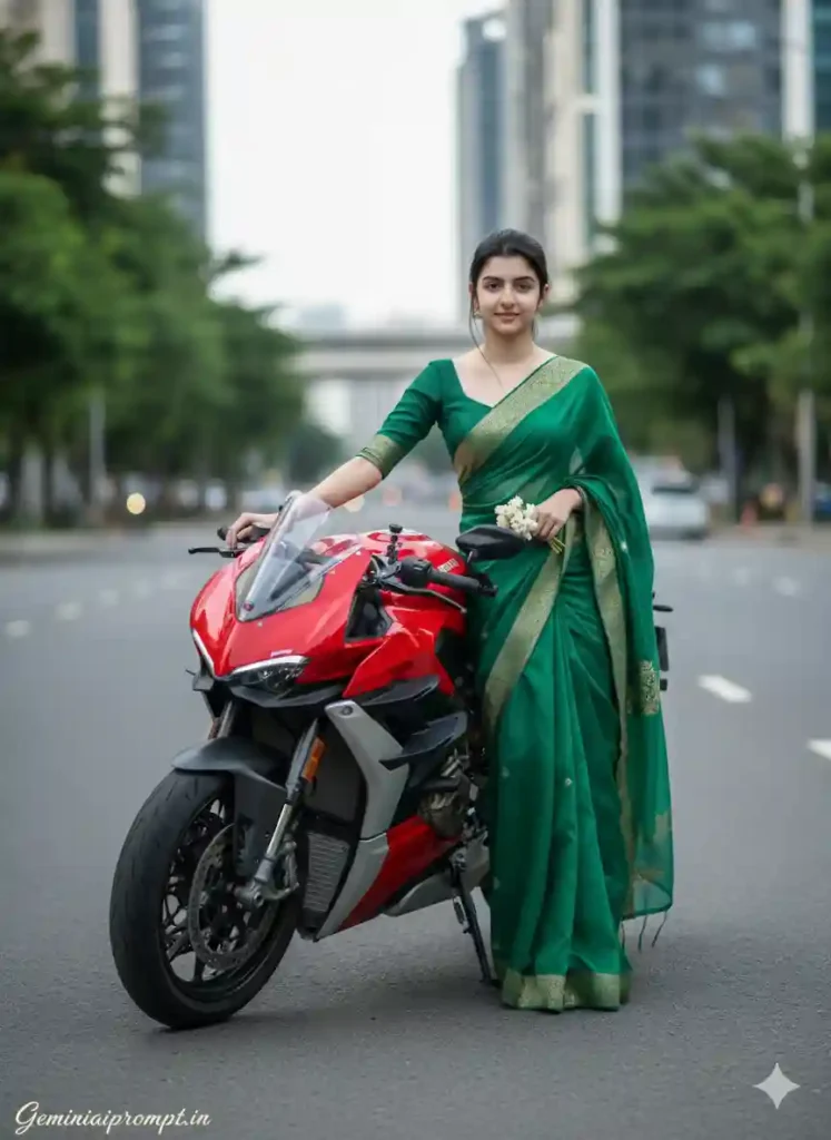 IMPORTANT – FACE LOCK Keep the subject’s real face exactly the same as the uploaded reference image. Do NOT change facial structure, jawline, eyes shape, nose, lips, skin tone, age, or expression. No beautification, no face swapping, no AI facial recreation. Preserve natural human skin texture, pores, fine details, and asymmetry. Face must look DSLR-real, fully human, not illustration, not anime, not cartoon. SCENE TYPE Ultra-realistic cinematic urban fashion photography, premium lifestyle shoot. SUBJECT & POSE DETAILS A beautiful Indian girl standing beside a red Ducati Streetfighter luxury bike on a wide city road. She is standing confidently with her body slightly angled away, face turned toward the camera. One hand placed lightly on the Ducati handlebar. Other hand holding a small bunch of white jasmine flowers. Elegant posture, strong feminine presence. EXPRESSION & MOOD • Soft confident smile • Calm, classy, premium vibe • Eyes looking directly into the camera • Poised and graceful expression OUTFIT DETAILS • Emerald green saree with fine gold embroidery • Lightweight silk fabric with visible weave • Matching deep green blouse with clean tailoring • Natural saree pleats flowing gently BIKE DETAILS • Ducati Streetfighter • Glossy red body with black accents • Sharp aggressive design • Metallic reflections clearly visible BACKGROUND & ENVIRONMENT • Modern city street • Tall buildings and trees in distance • Clean asphalt road • Background slightly softened, face razor-sharp LIGHTING & CAMERA • Natural daylight • Soft directional light on face • Balanced highlights and shadows • Professional DSLR photography look QUALITY & STYLE • Ultra-HD, 8K • Photorealistic • Zero face blur • No AI artifacts • Natural skin and fabric texture TEXT / SIGNATURE Add “Geminiaiprompt.in” at the bottom-left corner, HANDWRITTEN SIGNATURE-STYLE typography, thin cursive strokes, small size, subtle premium elegance, white or soft off-white color. ASPECT RATIO 3:4 vertical