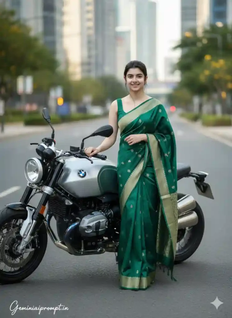 IMPORTANT – FACE LOCK Keep the subject’s real face exactly the same as the uploaded reference image. Do NOT change facial structure, eye shape, nose, lips, jawline, skin tone, age, or expression. No beauty filter, no face enhancement, no AI recreation. Preserve real human skin texture, pores, and natural imperfections. Face must look DSLR-real, fully human, not illustration, not anime. SCENE TYPE Ultra-realistic cinematic luxury street fashion photography, editorial magazine style. SUBJECT & POSE DETAILS A beautiful Indian woman standing in front of a BMW R NineT luxury bike on a clean city road. She is standing slightly angled toward the camera. One hand resting on the bike handlebar. Other hand softly lifting the edge of her saree pallu. Elegant posture with natural confidence. EXPRESSION & MOOD • Soft confident smile • Calm, classy, graceful expression • Eyes directly looking at the camera • Royal feminine presence OUTFIT DETAILS • Emerald green silk saree with subtle gold woven motifs • Premium silk texture clearly visible • Sleeveless matching blouse with clean tailoring • Saree pleats falling naturally BIKE DETAILS • BMW R NineT • Matte silver fuel tank with black accents • Premium retro-luxury build • Realistic metal reflections BACKGROUND & ENVIRONMENT • Open urban road • Trees and modern buildings softly visible • Clean asphalt surface • Background slightly softened, face fully sharp LIGHTING & CAMERA • Natural daylight • Soft sunlight illuminating face evenly • Balanced highlights and shadows • Professional DSLR photography QUALITY & REALISM • Ultra-HD 8K • Photorealistic • Zero blur on face • No AI artifacts • Natural skin & fabric detail TEXT / SIGNATURE Add “Geminiaiprompt.in” at the bottom-left corner, HANDWRITTEN SIGNATURE-STYLE typography, thin cursive strokes, small size, subtle premium elegance, white or soft off-white color. ASPECT RATIO 3:4 vertical