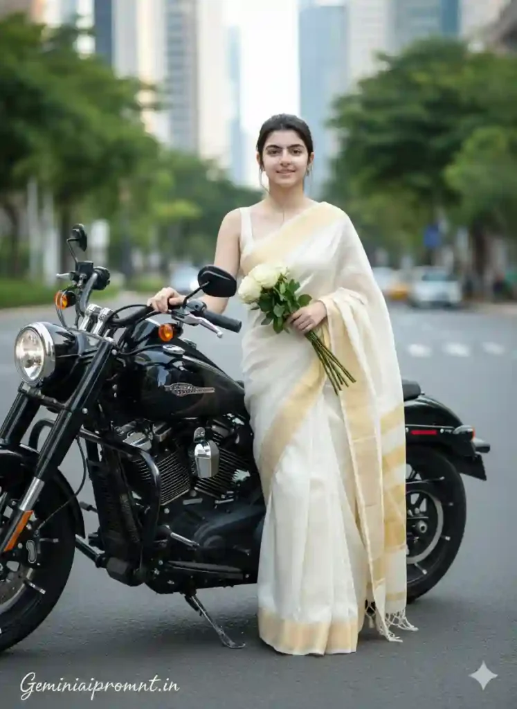 IMPORTANT – FACE LOCK Keep the subject’s real face exactly the same as the uploaded reference image. Do NOT change facial structure, jawline, eyes shape, nose, lips, skin tone, age, or expression. No beautification, no AI face recreation, no smoothing. Preserve real human skin texture, pores, fine lines, and natural asymmetry. Face must look DSLR-real, fully human, not illustration, not anime. SCENE TYPE Ultra-realistic cinematic luxury street fashion photography, magazine-cover style. SUBJECT & POSE DETAILS A beautiful Indian woman standing beside a black Harley-Davidson cruiser bike on an open city road. She is standing confidently with one hip slightly leaned toward the bike. One hand resting gently on the fuel tank. Other hand holding a small bouquet of white roses near her waist. Strong yet graceful posture. EXPRESSION & MOOD • Soft confident smile • Calm, classy, royal mood • Eyes directly looking at the camera • Elegant feminine presence OUTFIT DETAILS • Ivory white saree with delicate gold zari borders • Premium silk fabric with visible texture • Sleeveless matching blouse with clean stitching • Saree pleats flowing naturally with light wind BIKE DETAILS • Harley-Davidson luxury cruiser • Glossy black body with chrome highlights • Heavy premium look • Realistic reflections and metal texture BACKGROUND & ENVIRONMENT • Wide urban road • Trees and modern buildings in distance • Clean asphalt surface • Background slightly softened, face fully sharp LIGHTING & CAMERA • Natural daylight • Soft sunlight illuminating face • Balanced highlights and shadows • Professional DSLR photography QUALITY & REALISM • Ultra-HD 8K • Photorealistic • Zero blur on face • No AI artifacts • Natural skin & fabric details TEXT / SIGNATURE Add “Geminiaiprompt.in” at the bottom-left corner, HANDWRITTEN SIGNATURE-STYLE typography, thin cursive strokes, small size, subtle premium elegance, white or soft off-white color. ASPECT RATIO 3:4 vertical